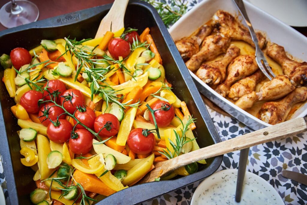 This panful is especially good in autumn, when you can use fresh, locally grown potatoes and squash. If the produce comes from your own garden, you can confidently leave the vegetables unpeeled – this makes cooking even quicker. If peeling is still needed, invite the children into the kitchen to help and cook together – even the youngest family members can take part with simple tasks. Once the vegetables are peeled and chopped, this comforting traybake practically cooks itself in the oven! Serve it with a simple yogurt–cream cheese sauce on the side.