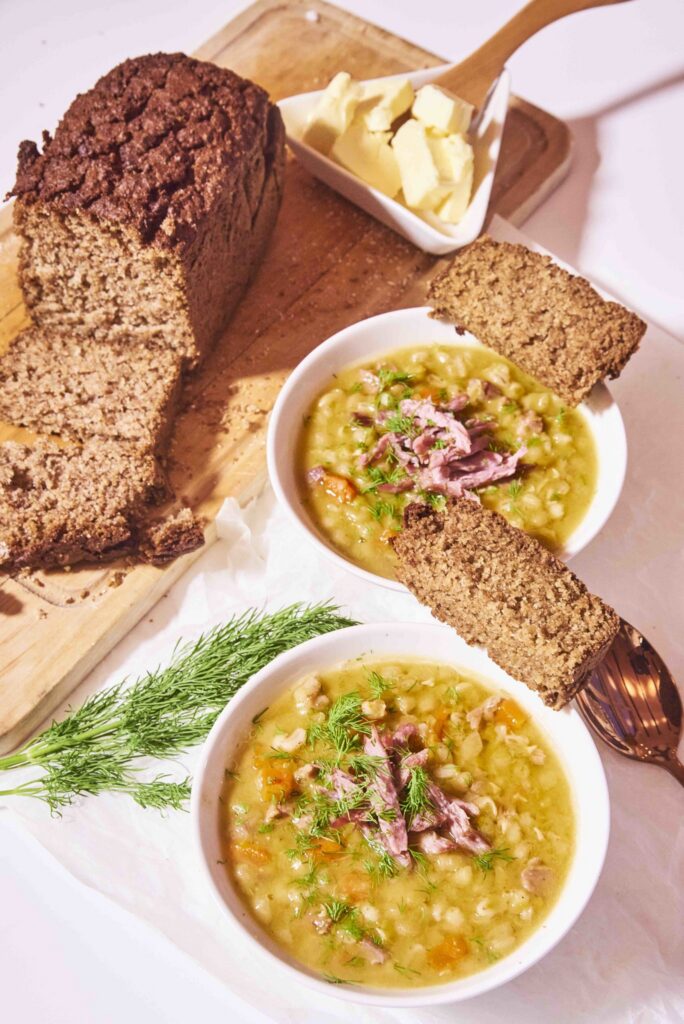 1. Pane kuivatatud herned vähemalt 8 tunniks või terveks ööks vette likku. Kurna hernestelt leotusvesi ja pane need koos seakoodiga potti 3–3,5 liitri külma veega keema. Kui supp muliseb, eemalda aeg­ajalt vaht. Keeda umbes tund. Koori ja haki porgandid ning sibul. Lisa need koos kruupidega supile. Keeda veel ligi tund. Seejärel tõsta seakoot supist välja. Rebi kondi kül­jest liha, tükelda ja pane lihatükid tagasi supi sisse. Maitsesta soola ja soovi korral pipraga. Serveeri leiva või karaskiga.