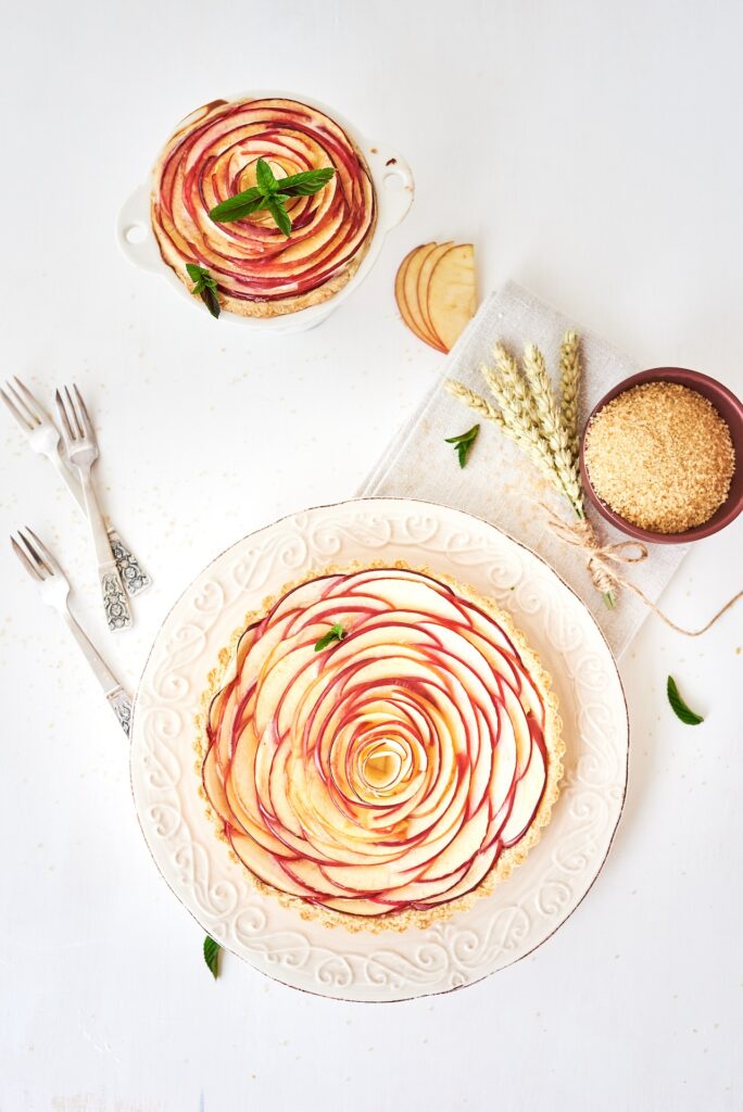 Eemalda õuntelt südamik ja jäta koor külge, siis saad koogist valmistada ilusa punase “roosi”. Puhastatud õunasektorid viiluta hästi õhukesteks viiludeks, mida õhemad, seda paremini saad neid vormida. Katteks sega kokku toorjuust, muna, vanillisuhkur ja suhkur. Võta koogipõhi kapist välja, kalla peale toorjuustukreem ning seejärel alusta õunaviilude sättimist. Alusta välimisest ringist, asetades õunad püstiselt punane koor üleval pool ringjalt mööda serva. Liigu selliselt ringe ladudes järjest sissepoole, kuni oled ära katnud terve koogi. Päris keskele vormi ühest õunaviilust toru ja torka see “roosi” südamikuks. Küpseta 160 kraadi juures 40 minutit. Enne serveerimist lase koogil veidi jahtuda.